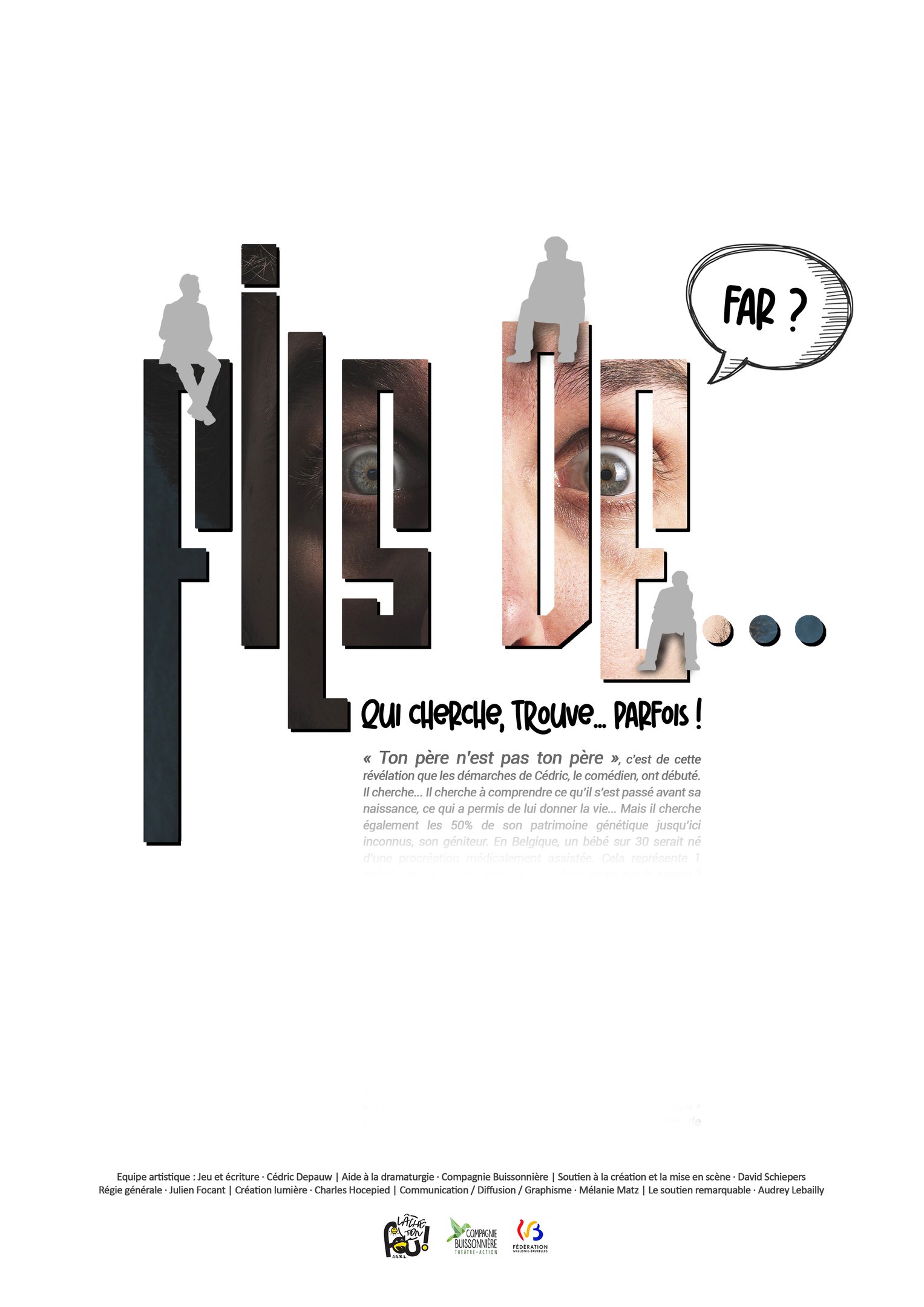 « Ton père n’est pas ton père », c’est de cette révélation que les démarches de Cédric, le comédien, ont débuté. Il cherche… Il cherche à comprendre ce qu’il s’est passé avant sa naissance, ce qui a permis de lui donner la vie… Mais il cherche également les 50% de son patrimoine génétique jusqu’ici inconnus, son géniteur. En Belgique, un bébé sur 30 serait né d’une procréation médicalement assistée. Cela représente 1 enfant par classe, en moyenne… Combien parmi eux le savent ? Combien parmi eux sont issus d’un don de sperme anonyme ? Son donneur anonyme, aurait offert sa semence dans un petit pot, au début des années 80 ! Un voyage dans l’univers de la Procréation Médicalement Assistée et de ses dérives. Ce spectacle passe avec beaucoup d’humour, du monde animal à la plus grande banque de sperme d’Europe en abordant également le sujet des tests ADN dit « récréatifs » mais interdits en Belgique. C’était sans compter sur internet qui permet l’accès à des banques de données internationales à quiconque effectue un test génétique. Aujourd’hui, on encourage les parents à tout raconter aux enfants, à leur permettre de comprendre comment ils sont nés… Mais il y a quelques années encore, on conseillait aux parents de ne rien dire et de le cacher à tout le monde. Un secret souvent lourd à porter, parfois lourd à révéler… Ce « papa » pourrait bien un jour se retrouver dans la même salle de spectacle que lui…